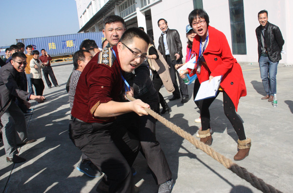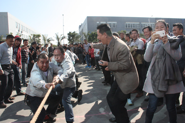 下午,一場別開生面的拔河比賽將活動推向小高潮。拔河比賽以促進(jìn)企業(yè)交流為宗旨,豐富職工體育活動為目的,為企業(yè)搭建展現(xiàn)集體風(fēng)采的舞臺,從而發(fā)揚團(tuán)隊精神,增強(qiáng)凝聚力。此次比賽園區(qū)企業(yè)積極響應(yīng),共有11個企業(yè)組隊參加,特別是有些企業(yè)為了參賽,臨時停工,比賽結(jié)束后回單位繼續(xù)生產(chǎn),體現(xiàn)了園區(qū)大家庭的凝聚力。每支參賽隊伍共15人,其中男生10人,女生5人,實行淘汰制晉級方式。當(dāng)比賽哨聲響起,各參賽隊員們口中一起高呼“一二,一二”,雙手緊握長繩,憋足勁拼命往后拉,拉拉隊在旁助陣加油,恨不得抓起繩子跟隊員們一起努力,各種加油聲、吶喊聲此起彼伏,回響至整個園區(qū)。經(jīng)過激烈較量,最終冠捷科技獲得冠軍,瑞達(dá)物業(yè)獲得亞軍。